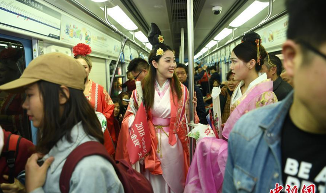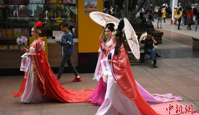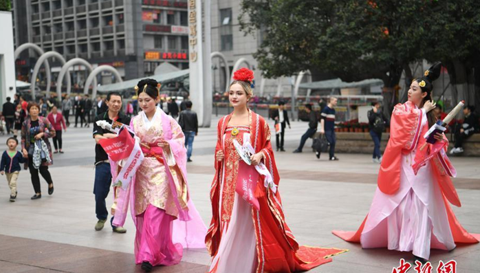 3月30日,重慶觀(guān)音橋步行街上幾位美女身著(zhù)古裝玩穿越。據悉,她們這樣的裝扮是為了參加重慶一景區的宣傳活動(dòng),在鬧市為景區文化進(jìn)行宣傳。圖為幾位美女身著(zhù)古裝穿越步行街。