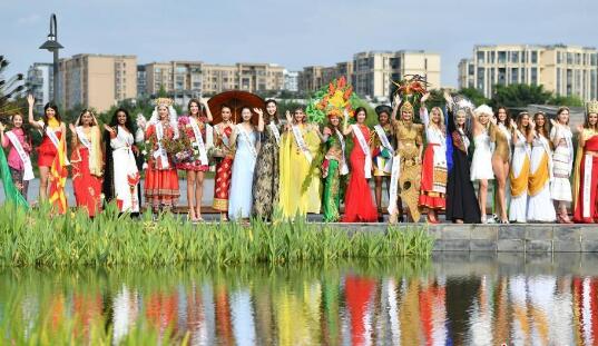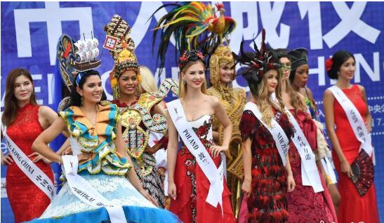 7月19日下午,2019國際友誼小姐花車(chē)巡游盛裝入城儀式在成都市雙流區拉開(kāi)帷幕。來(lái)自世界60余個(gè)國家與地區的佳麗身著(zhù)各國盛裝,乘坐電動(dòng)公交車(chē)巡游,走紅毯秀,盡展曼妙身姿,為成都市民帶來(lái)一場(chǎng)視覺(jué)盛宴。圖為國際友誼小姐盛裝斗艷。
